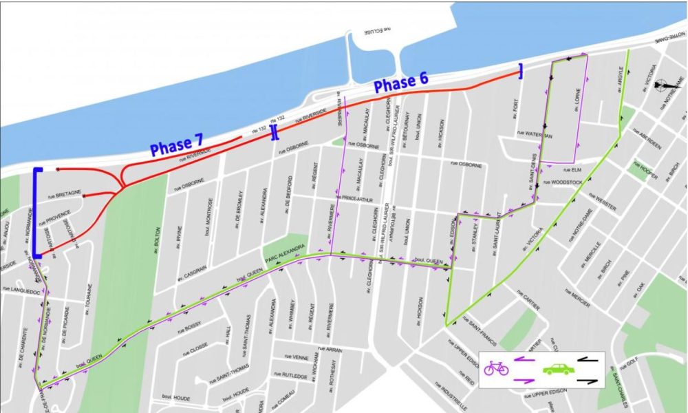Afin d’exécuter les travaux de la phase 6 (2019), la rue Riverside est également fermée entre les avenues Fort et Alexandra.